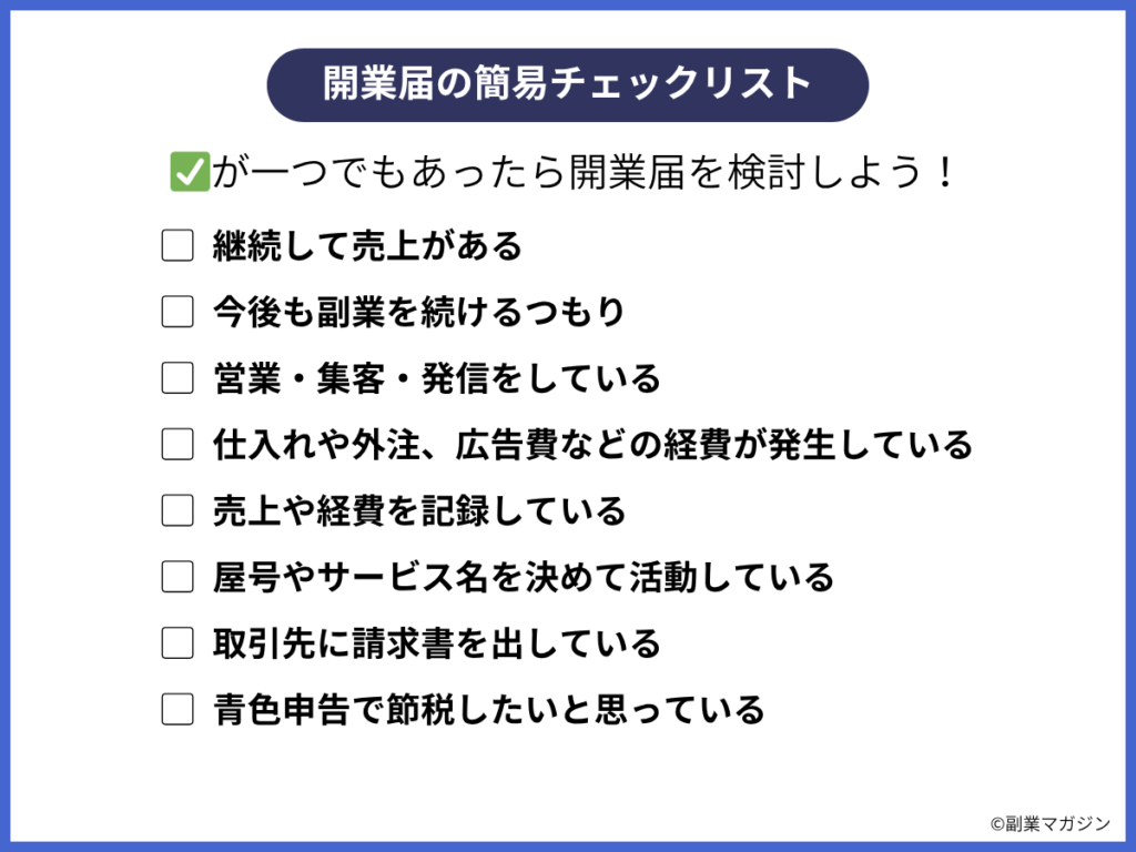 そのため、毎月売上がある人や、すでに営業・仕入れ・請求・記帳を始めている人は、「まだ副業だから」と後回しにせず、早めに開業届を出す準備をしましょう。